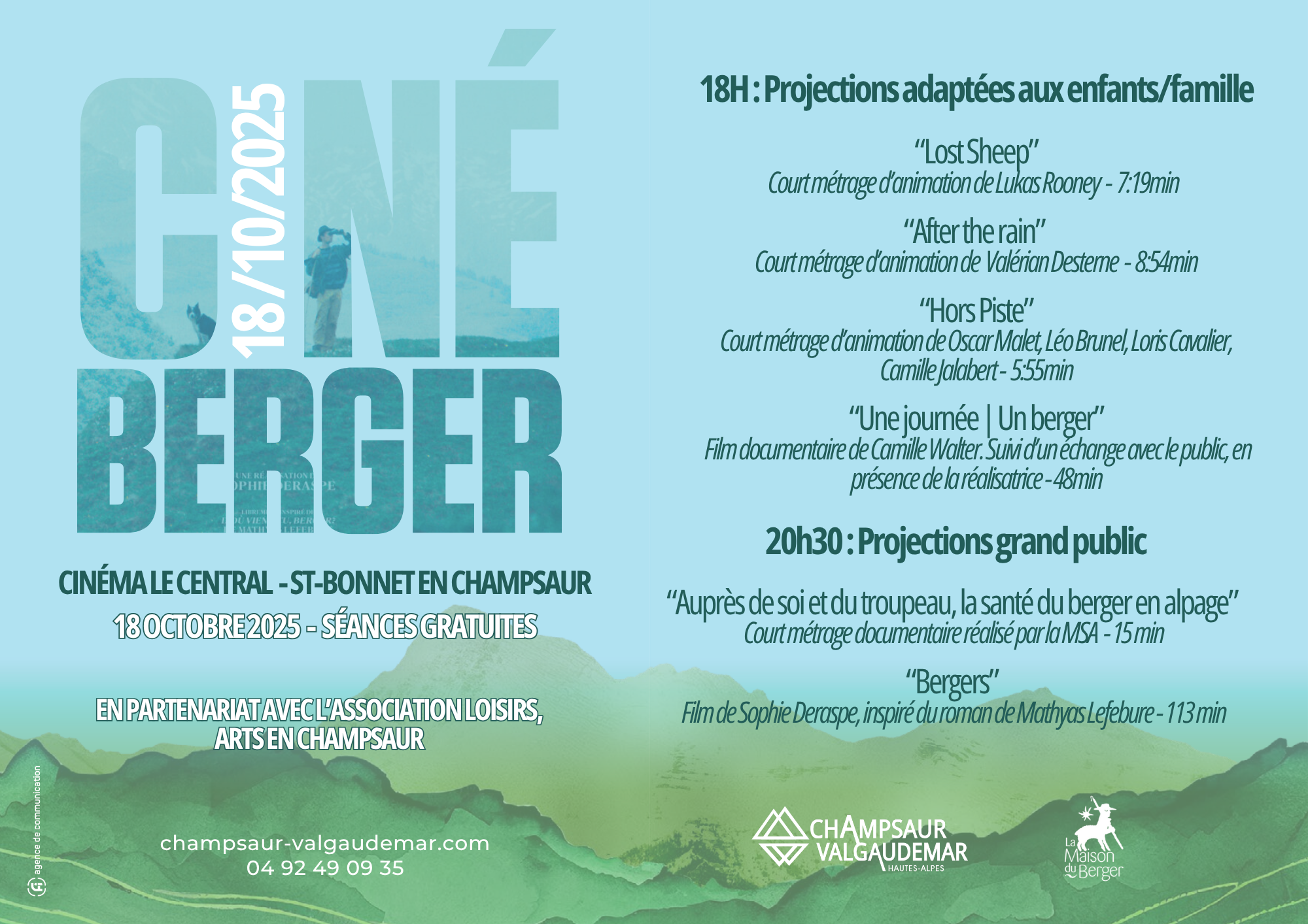 Ciné Berger propose cette séance pour le grand public. Avec un court métrage "de soi et du troupeau, la santé du berger en alpage" (15 min, par la MSA) et le film "Bergers" (113 min) de Sophie Deraspe, inspiré du roman de Mathyas Lefebure.